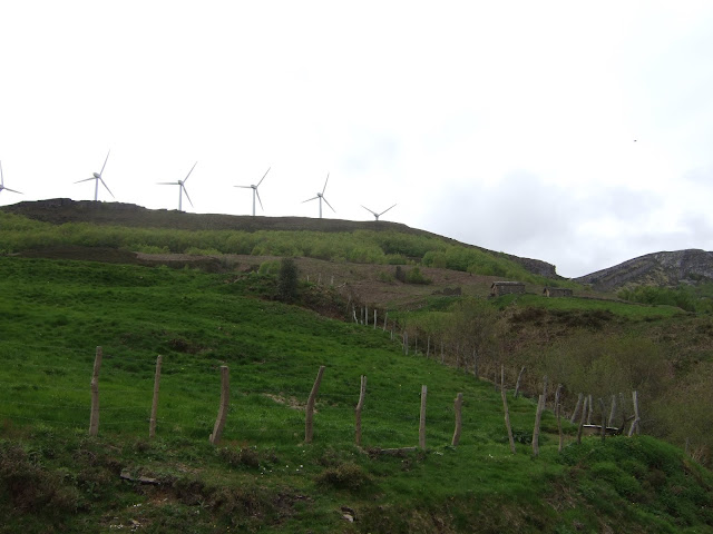 You come out just below the main road that leads to the Sía pass, with Imunía and Peña Lusa before youThe old and the new: huts in Rulao to the right and the Sía wind farm up on the left